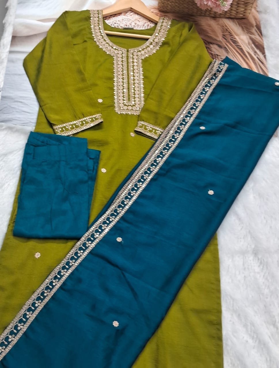 This ready-to-wear three-piece suit offers a vibrant contrast, pairing a stunning olive green kurta with rich peacock blue trousers and dupatta. The kurta’s neckline is beautifully adorned with intricate gold zari and sequin embroidery, adding an immediate touch of luxury. The ensemble is completed with a matching blue dupatta finished with decorative gold borders, perfect for any festive or special occasion.