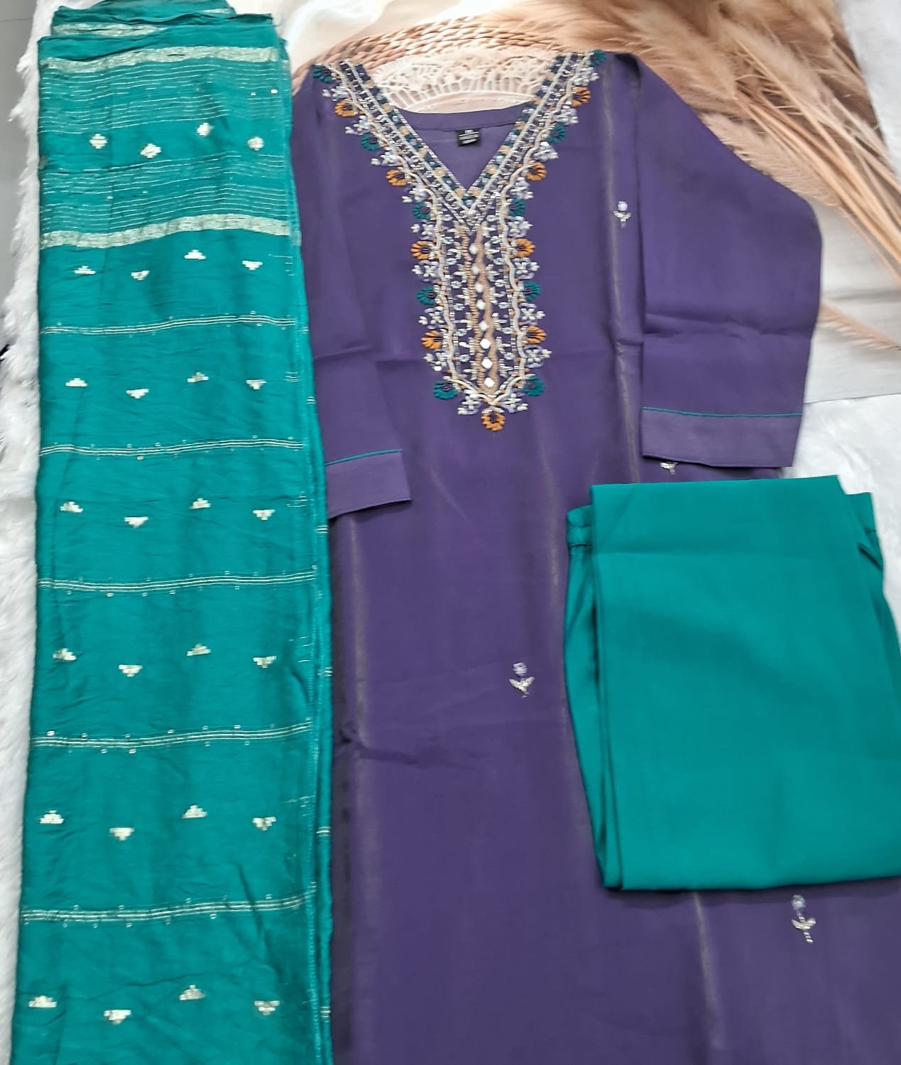This striking ready-to-wear three-piece suit offers a rich contrast between the deep plum/aubergine kurta and the vibrant teal trousers and dupatta. The kurta’s neckline is intricately detailed with beautiful multi-color thread and bead embroidery for a sophisticated touch. The flowing teal dupatta is enhanced with shimmering gold accents, making this ensemble a standout choice for any festive occasion.