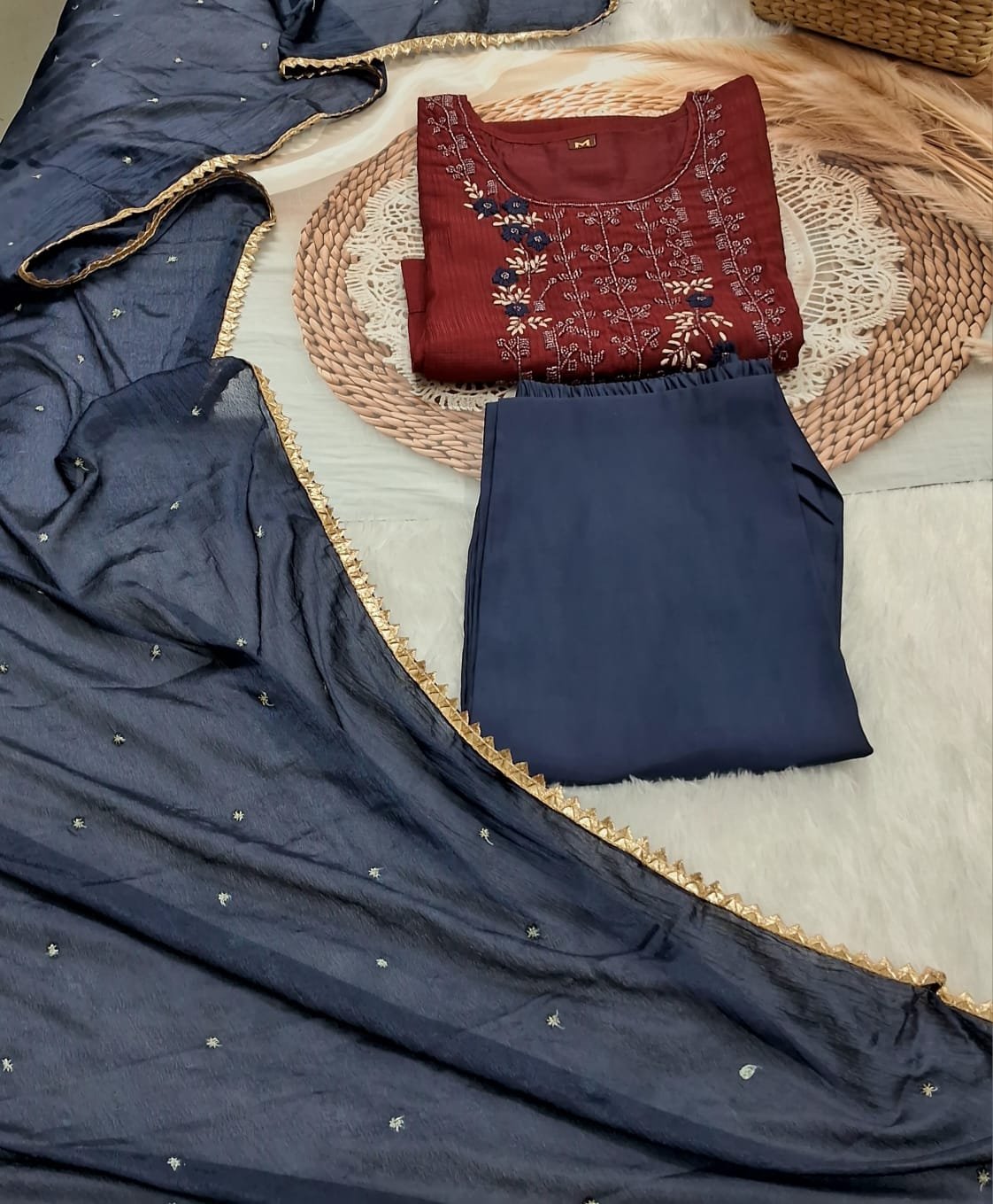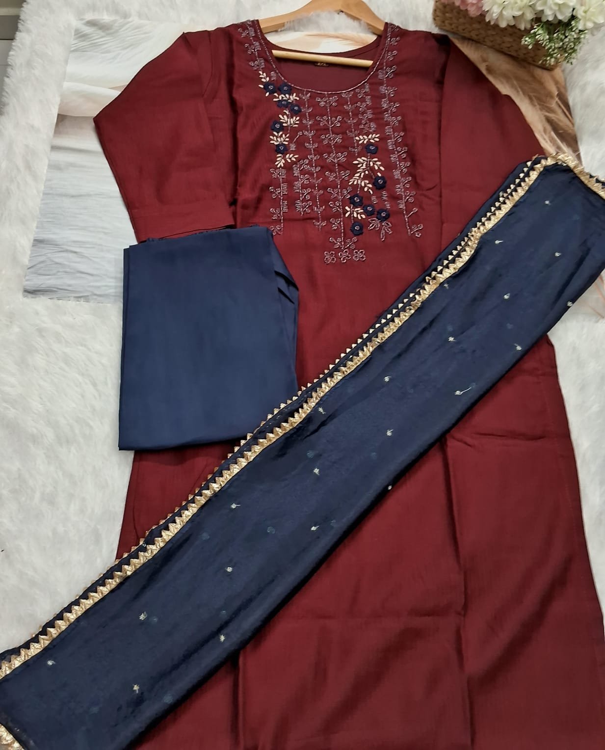 This elegant ready-to-wear suit showcases a dramatic contrast between the rich garnet red kurta and the sophisticated navy blue dupatta and trousers. The kurta is beautifully detailed with intricate multi-color thread embroidery on the yoke, while the navy dupatta features delicate gold trim, ensuring a refined and effortlessly festive look.