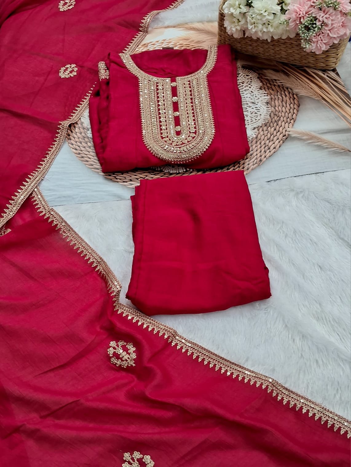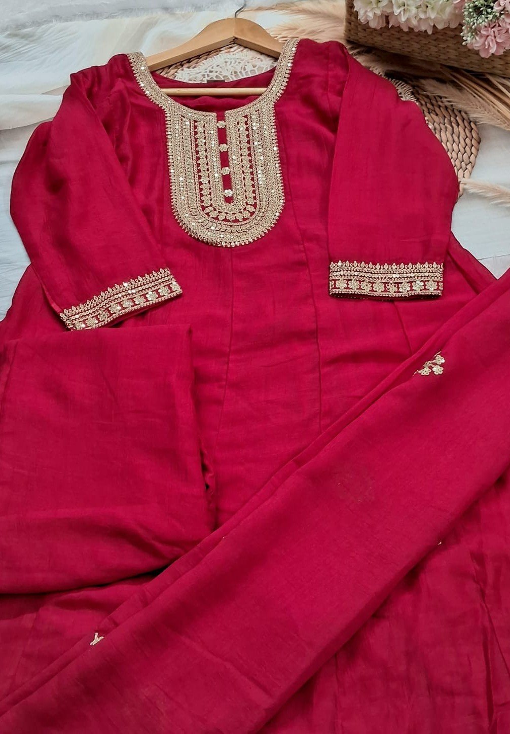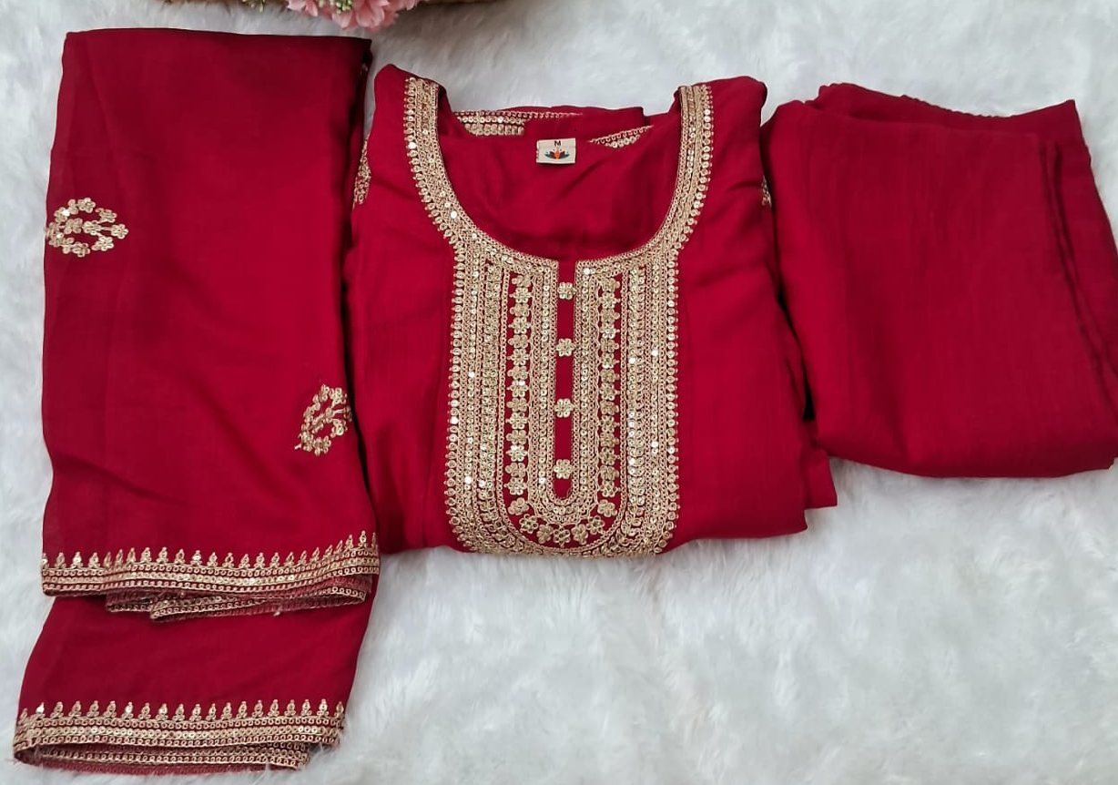 Step into instant elegance with this stunning, fully stitched Deep Red Anarkali Suit, featuring a flattering flare and exquisite gold Gota Patti embroidery on the yoke. The complete outfit includes a coordinating dupatta finished with a beautiful scalloped border, offering a luxurious, ready-to-wear look. Perfect for any wedding, festival, or grand event, this majestic piece saves you the hassle of tailoring.