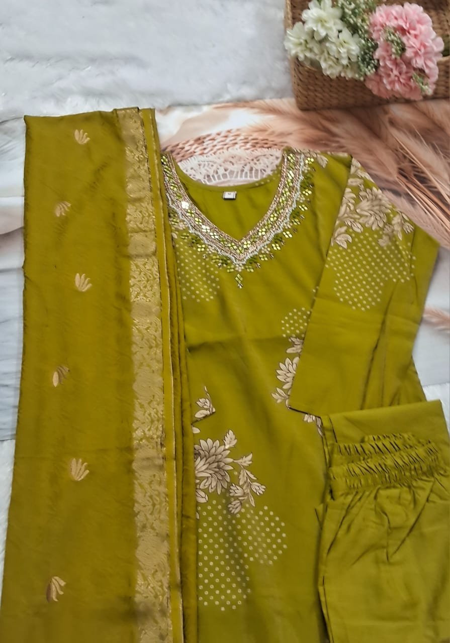 This vibrant ready-to-wear suit is cast in a rich chartreuse green, featuring an intricately detailed V-neckline adorned with gold sequins and pearl-like embellishments. The set includes matching fitted bottoms and a tonal dupatta, enhanced with shimmering gold borders and subtle embroidery. This stunning ensemble offers a bold, festive look that requires minimal styling.