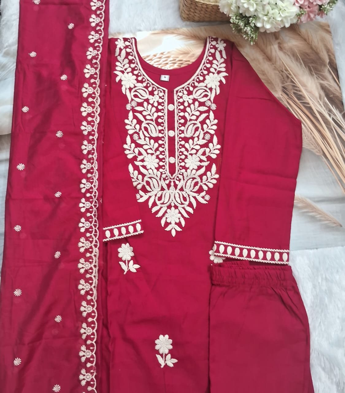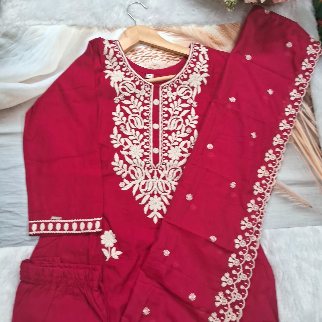 This striking ready-to-wear suit is crafted in a luxurious deep ruby/crimson hue, featuring a stunning contrast with dense white floral threadwork across the entire yoke. The ensemble includes a matching tonal dupatta with scattered white motifs and perfectly finished trousers. Ready for any festive event, this suit offers a beautiful blend of rich color and traditional embroidery.