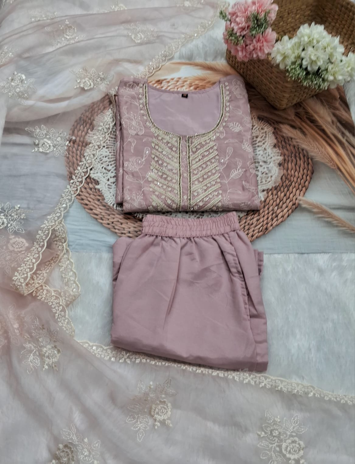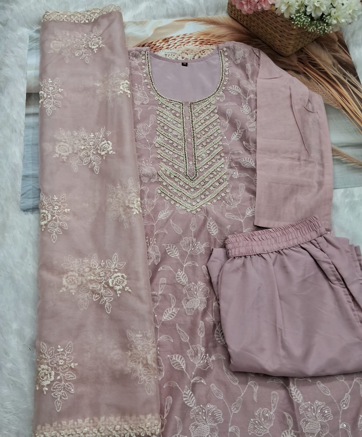 This exceptional designer suit is draped in a sophisticated dusty rose silk blend, featuring an all-over intricate tonal floral threadwork. The neckline is exquisitely detailed with hand-placed pearl and sequin work, while the sheer dupatta showcases complementary embroidery and a delicate scalloped border. This timeless set is a true investment in luxury and feminine elegance.