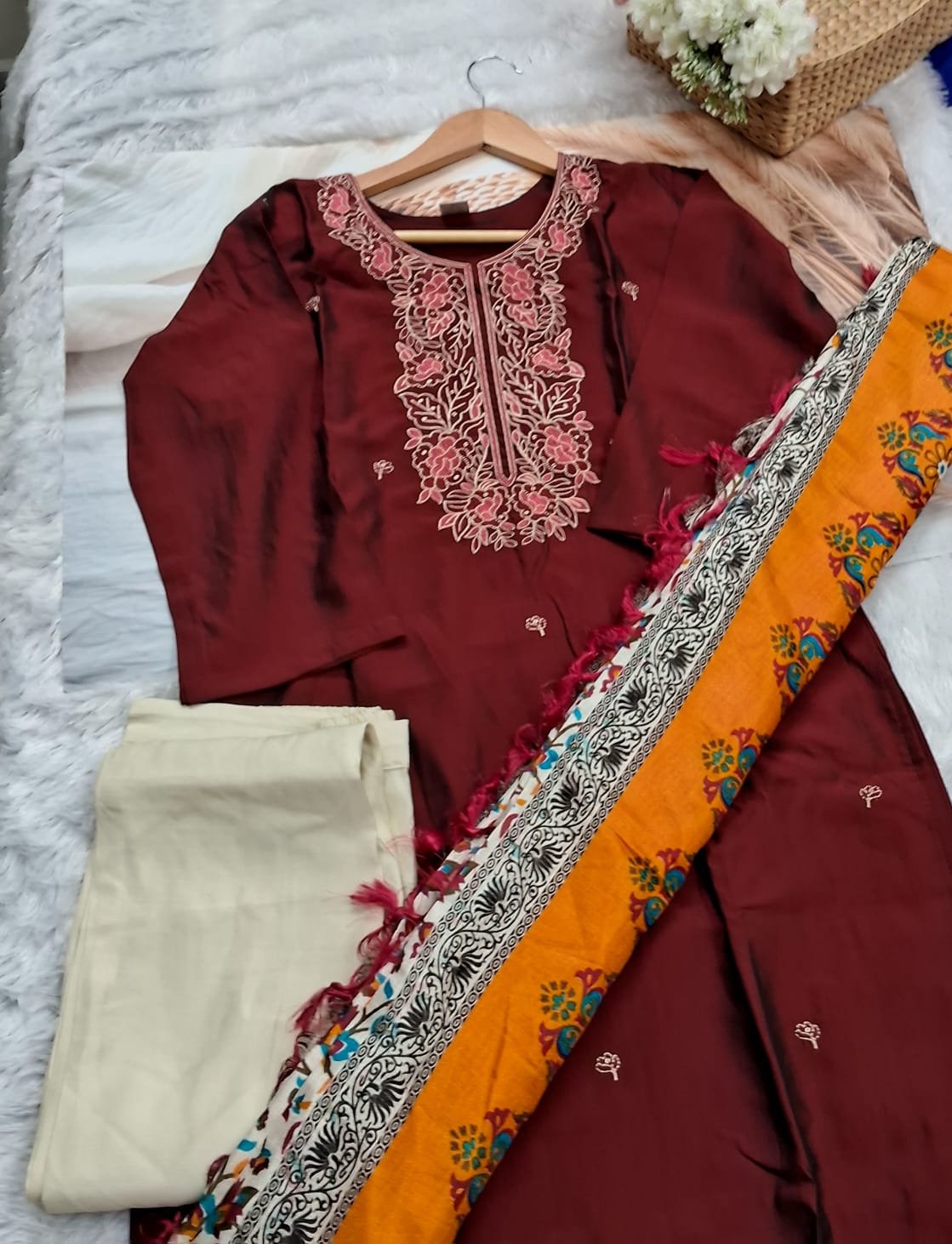 This exquisite ready-to-wear suit features a deep maroon kurta adorned with delicate pink floral thread embroidery on the neckline. The vibrant contrast is created by the eye-catching mustard yellow printed dupatta, playfully accented with tassels along the edge, and balanced with soft off-white bottoms. An ideal pick for festive occasions, this ensemble blends traditional artistry with modern flair.